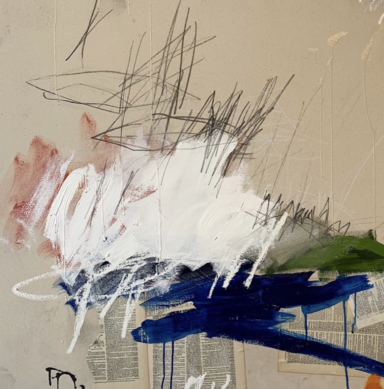 Abstract painting with white, red, black, blue, and green brushstrokes on a beige wall with newspaper cutouts.